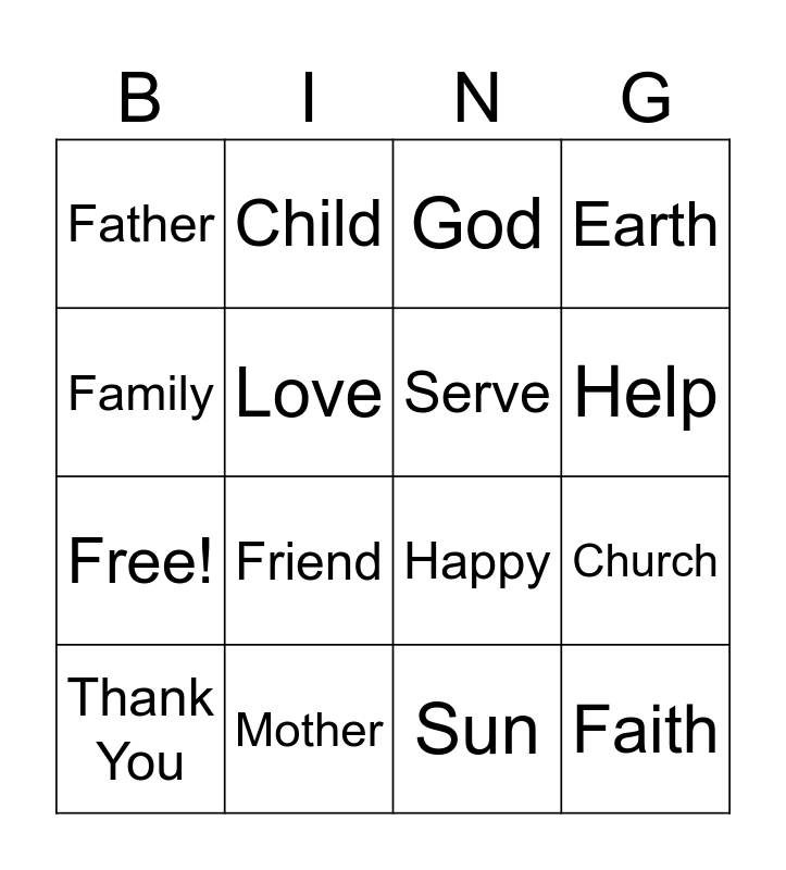 This bingo card has 20 words: Church, Temple, God, Jesus, Thank You, Family, Mother, Father, Free!, Child, Friend, Happy, Love, Faith, Serve, Shine, Help, Earth, Sun and Heart.