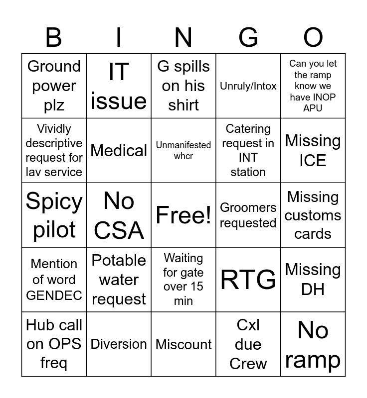 This bingo card has a free space and 24 words: Potable water request, Diversion, Unmanifested whcr, Hub call on OPS freq, Can you let the ramp know we have INOP APU, Ground power plz, Vividly descriptive request for lav service, IT issue, Groomers requested, Waiting for gate over 15 min, Catering request in INT station, Spicy pilot, RTG, Missing DH, Medical, Cxl due Crew, Missing customs cards, G spills on his shirt, Missing ICE, No CSA, No ramp, Mention of word GENDEC, Unruly/Intox and Miscount.