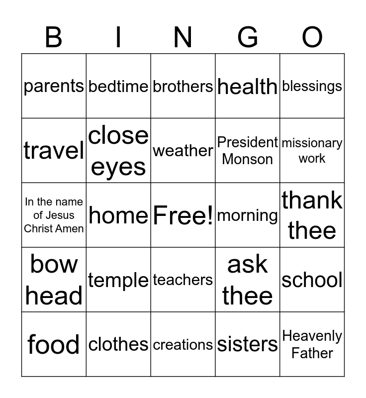 This bingo card has a free space and 28 words: school, fold arms, President Monson, sisters, travel, brothers, bedtime, bow head, morning, food, In the name of Jesus Christ Amen, health, clothes, creations, missionary work, friends, temple, close eyes, weather, teachers, parents, safety, Heavenly Father, home, thank thee, ask thee, blessings and garden.