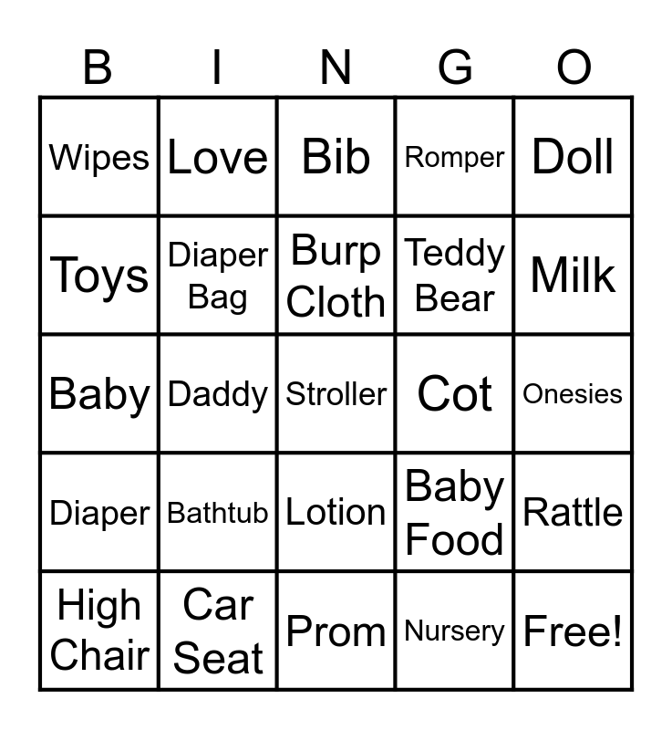 This bingo card has 33 words: Free!, Crib, Daddy, Mommy, Diaper, Diaper Bag, Doll, High Chair, Love, Swaddle, Burp Cloth, Bib, Bottle, Bouncy Seat, Cot, Milk, Car Seat, Baby, Bathtub, Baby Food, Lotion, Swing, Wipes, Onesies, Prom, Stroller, Romper, Teddy Bear, Toys, Rattle, Night Lamp, Nursery and Nursery Rhyme.