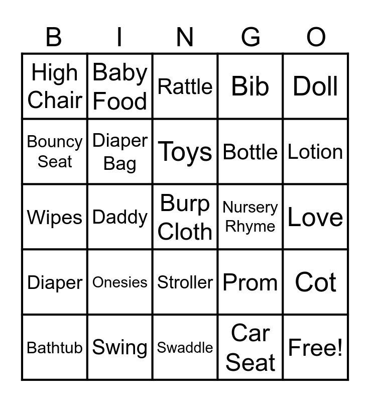 This bingo card has 33 words: Free!, Crib, Daddy, Mommy, Diaper, Diaper Bag, Doll, Bathtub, Baby Food, Teddy Bear, Toys, Rattle, Night Lamp, Nursery, Nursery Rhyme, Lotion, Swing, Wipes, Onesies, Prom, Stroller, Romper, High Chair, Love, Swaddle, Burp Cloth, Bib, Bottle, Bouncy Seat, Cot, Milk, Car Seat and Baby.