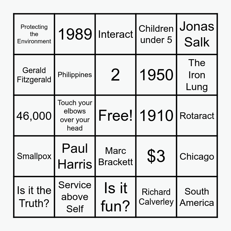 This bingo card has a free space and 36 words: 1985, >2.5billion, 1979, Philippines, $3, Smallpox, 2, 1952, Jonas Salk, Nigeria, Touch your elbows over your head, Children under 5, Early 1800’s in Europe, 1910, The Iron Lung, Protecting the Environment, 1905, Paul Harris, South America, Interact, Rotaract, Chicago, Service above Self, Is it the Truth?, Is it fun?, 1989, 46,000, 728, 1950, Gerald Fitzgerald, Derek Hardacker, 25yrs, Richard Calverley, Marc Brackett, 5020 and Western WA and Vanc Isl.