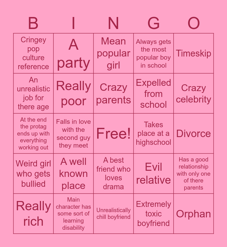 This bingo card has a free space and 29 words: Really rich, Evil parents, Falls in love with the second guy they meet, White protagonist, Cringey pop culture reference, Mean popular girl, Really poor, A well known place, Takes place at a highschool, Main character has some sort of learning disability, Divorce, Orphan, Unrealistically chill boyfriend, Extremely toxic boyfriend, Crazy celebrity, Someone who has a talent no one knows about, A best friend who loves drama, Weird girl who gets bullied, Timeskip, At the end the protag ends up with everything working out, Evil relative, A pick me, Expelled from school, An unrealistic job for there age, Always gets the most popular boy in school, A party, Has a good relationship with only one of there parents, Crazy parents and A common talent they are obsessed with.
