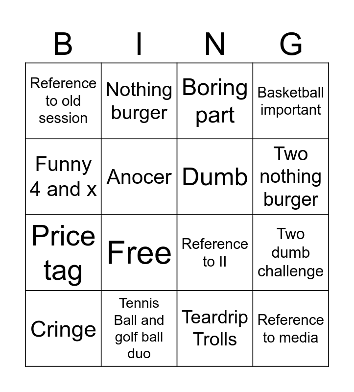 This bingo card has 20 words: Two dumb challenge, Clock winer simp!!!, Boring part, Someone dies, Cringe, Funny 4 and x, Tennis Ball and golf ball duo, Reference to old session, Price tag, Nothing burger, Free, Reference to II, Anocer, Reference to media, Dumb, Funny meme and bold moment, Two nothing burger, Basketball important, Teardrip Trolls and Snowball fail.