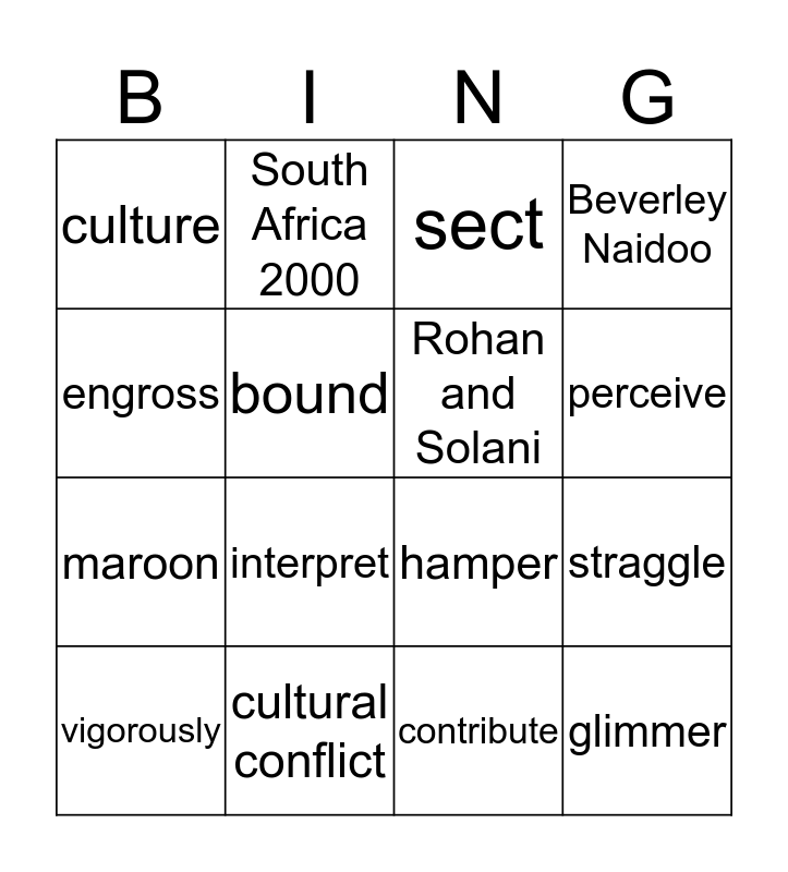 This bingo card has a free space and 15 words: vigorously, glimmer, sect, culture, perceive, engross, interpret, contribute, bound, maroon, straggle, Beverley Naidoo, Rohan and Solani, South Africa 2000 and cultural conflict.