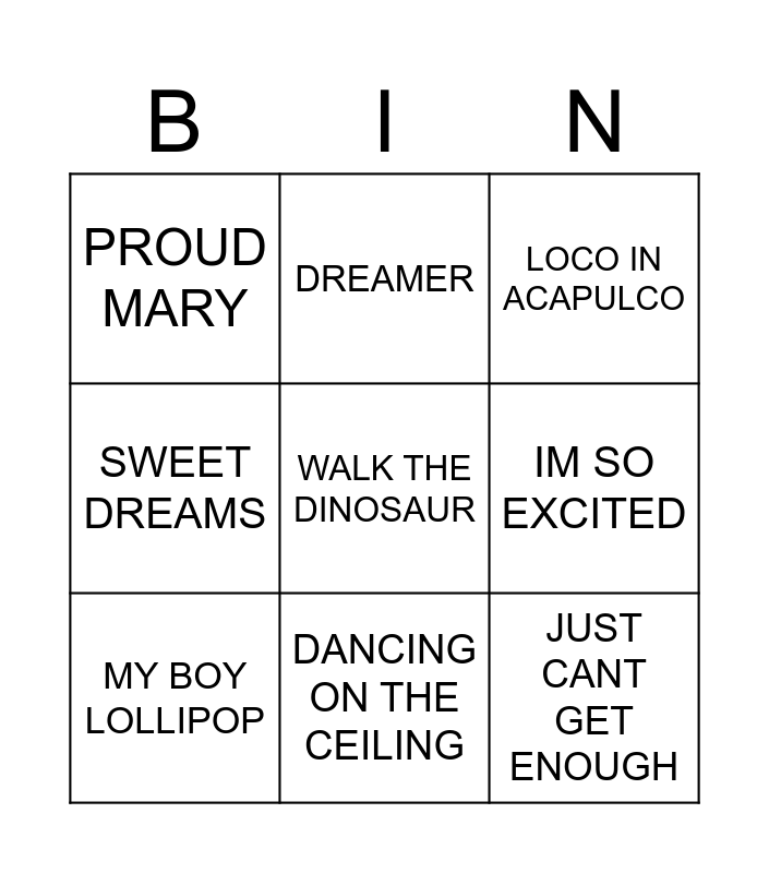 This bingo card has 60 words: WONDERWALL, HEATWAVE, DANCING IN THE STREET, MOVE ON UP, LOVE SHACK, HIPPY HIPPY SHAKE, MY BOY LOLLIPOP, YOUNG HEARTS RUN FREE, JUST CANT GET ENOUGH, I THINK WERE ALONE NOW, SWEET DREAMS, RIO, IM SO EXCITED, WAKE ME UP BEFORE YOU GO GO, WALKING ON SUNSHINE, PROUD MARY, YOU CAN CALL ME AL, WALK THE DINOSAUR, INTO THE GROOVE, DANCING ON THE CEILING, MAKING YOUR MIND UP, LOCO IN ACAPULCO, UPSIDE DOWN, SUPER FREAK, GET DOWN ON IT, GOLD, RELAX, SOMEBODY ELSES GUY, ITS A LOVE THING, TIGER FEET, ROCKIN ALL OVER THE WORLD, CAR WASH, CHILDREN, NEVER GONNA GIVE YOU UP, DREAMER, FREED FROM DESIRE, GET READY FOR THIS, FINALLY, LET ME ENTERTAIN YOU, GROOVE IS IN THE HEART, NO LIMIT, MR VAIN, RYTHM IS A DANCER, BOOM SHAKE THE ROOM, THE KEY THE SECRET, RYTHM OF THE NIGHT, LE FREAK, LIVIN' ON A PRAYER, LADIES NIGHT, DONT STOP MOVIN, THE HUSTLE, ABC, REET PETITE, COPACABANA, CRAZY LITTLE THING CALLED LOVE, PLAY THAT FUNKY MUSIC, DISCO INFERNO, UPTOWN FUNK, BLAME IT ON THE BOOGIE and PUMP UP THE JAM.