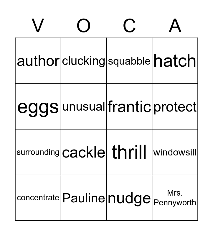 This bingo card has a free space and 15 words: concentrate, Mrs. Pennyworth, squabble, author, protect, eggs, cackle, nudge, unusual, surrounding, windowsill, hatch, frantic, clucking and Pauline.