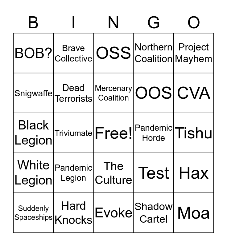 This bingo card has a free space and 24 words: Pandemic Legion, Hard Knocks, Mercenary Coalition, Suddenly Spaceships, Project Mayhem, BOB?, Snigwaffe, Brave Collective, Pandemic Horde, The Culture, OOS, Black Legion, Test, Hax, Dead Terrorists, Shadow Cartel, Tishu, OSS, CVA, Triviumate, Moa, White Legion, Northern Coalition and Evoke.