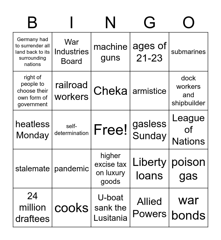 This bingo card has a free space and 24 words: pandemic, cooks, Cheka, 24 million draftees, submarines, Germany had to surrender all land back to its surrounding nations, right of people to choose their own form of government, War Industries Board, gasless Sunday, higher excise tax on luxury goods, armistice, heatless Monday, Liberty loans, poison gas, railroad workers, Allied Powers, League of Nations, machine guns, dock workers and shipbuilder, self-determination, war bonds, stalemate, ages of 21-23 and U-boat sank the Lusitania.