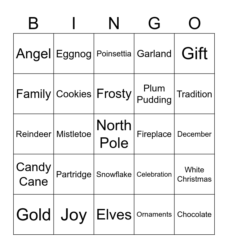 This bingo card has 73 words: Free!, Advent, Angel, Bells, Blizzard, Candle, Candy Cane, Carolers, Celebration, Chimney, Chocolate, Christmas, Cookies, December, Decorations, Eggnog, Elves, Family, Festive, Fireplace, Frosty, Garland, Gift, Gingerbread, Gold, Grinch, Holiday, Holly, Icicle, Jingle, Joy, Krampus, Lights, Manger, Mistletoe, Mittens, Nativity, Noel, North Pole, Nutcracker, Ornaments, Partridge, Party, Pine, Pinecone, Plum Pudding, Poinsettia, Polar Express, Presents, Reindeer, Ribbon, Rudolph, Santa, Scrooge, Sleigh, Snow, Snowball, Snowflake, Snowman, Star, Stocking, Tinsel, Toy, Tradition, Tree, Turkey, Twinkle, Wassail, White Christmas, Winter, Wreath, Zest and Joyful.