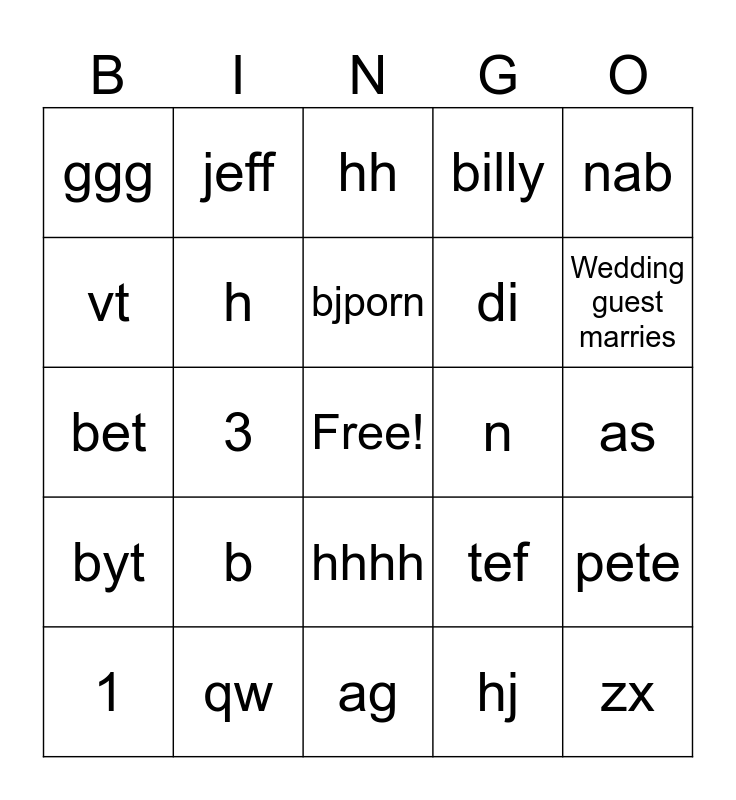This bingo card has a free space and 29 words: 1, 2, 3, fff, ggg, hh, h, b, n, qw, as, zx, ag, hj, Wedding guest marries, fff, hhhh, byt, nab, bet, tef, hil, di, vt, billy, jeff, pete, bjporn and ki,.