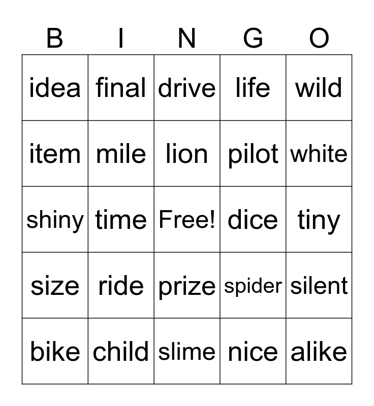 This bingo card has a free space and 26 words: prize, nice, lion, child, wild, idea, item, final, tiny, spider, pilot, shiny, silent, bike, time, ice, life, size, drive, alike, white, slime, dice, ride, mile and bride.