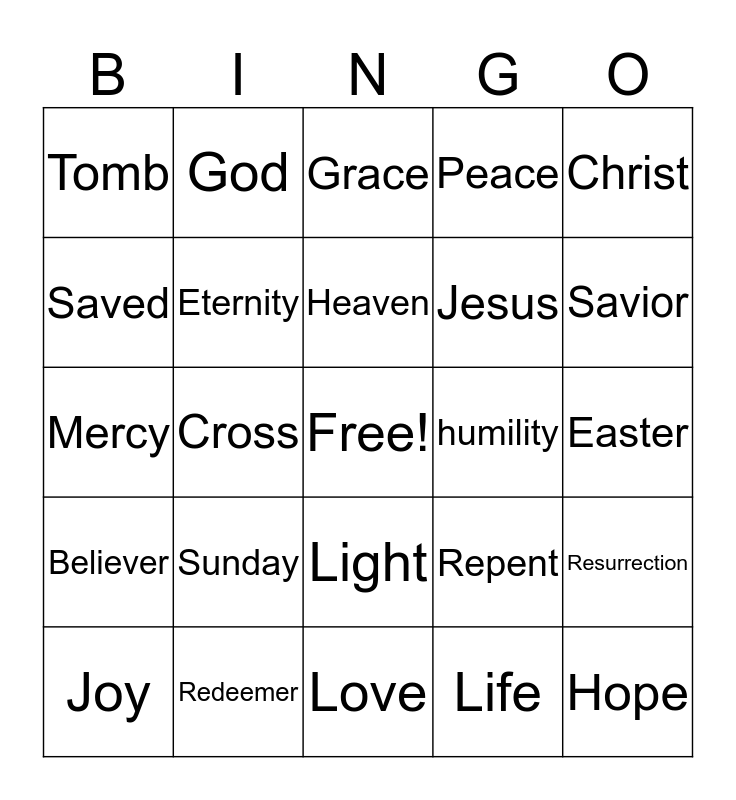 This bingo card has a free space and 24 words: Sunday, Redeemer, Heaven, Joy, Christ, Tomb, Saved, God, humility, Light, Jesus, Mercy, Repent, Resurrection, Eternity, Life, Easter, Grace, Savior, Cross, Hope, Believer, Peace and Love.