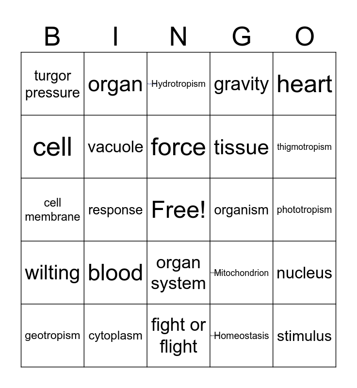 This bingo card has 3 images, a free space and 24 words: blood, cytoplasm, force, geotropism, heart, turgor pressure, cell, organ, organism, organ system, tissue, cell membrane, Mitochondrion, nucleus, vacuole, Homeostasis, phototropism, Hydrotropism, thigmotropism, response, stimulus, wilting, gravity and fight or flight.