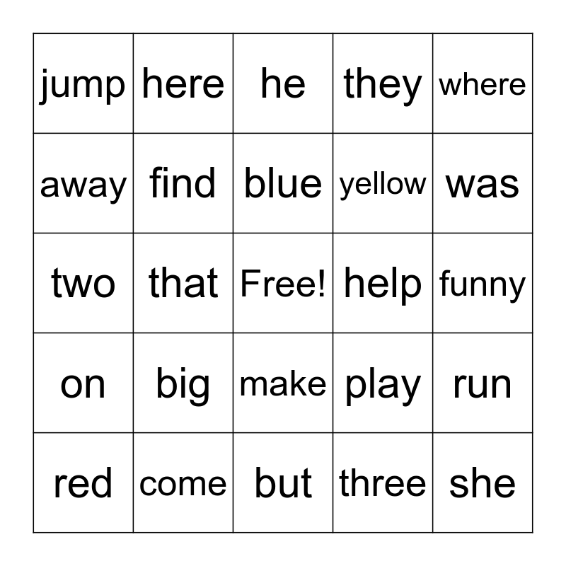 This bingo card has a free space and 24 words: big, come, blue, red, where, jump, away, here, help, make, yellow, two, play, run, find, three, funny, he, was, that, she, on, they and but.