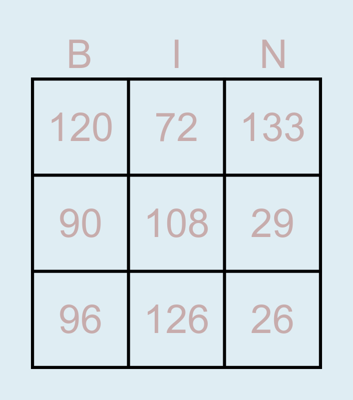 This bingo card has a free space and 8 words: 29, 133, 72, 96, 120, 26, 90 and 126.