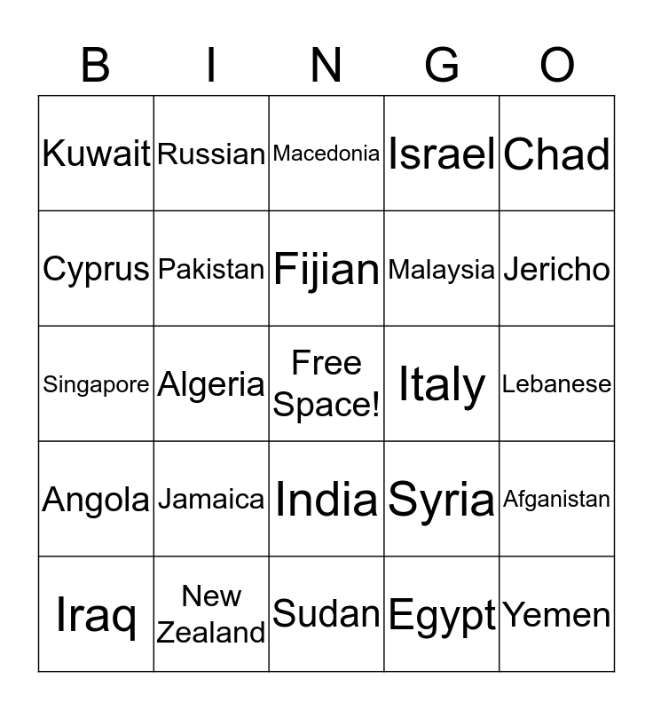 This bingo card has a free space and 24 words: Jamaica, New Zealand, Fijian, Iraq, Chad, Kuwait, Cyprus, Russian, Italy, India, Malaysia, Singapore, Syria, Afganistan, Pakistan, Egypt, Lebanese, Macedonia, Jericho, Algeria, Yemen, Angola, Israel and Sudan.