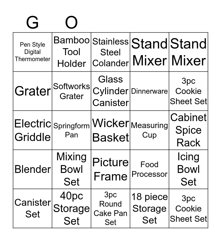 This bingo card has a free space and 29 words: Canister Set, AirBake Pizza Pan, Springform Pan, Utility Whisk, Pen Style Digital Thermometer, Stainless Steel Colander, Softworks Grater, Mixing Bowl Set, Measuring Cup, 40pc Storage Set, Cabinet Spice Rack, 3pc Cookie Sheet Set, 3pc Round Cake Pan Set, 18 piece Storage Set, 3pc Cookie Sheet Set, Bath Towels, Picture Frame, Blender, Stand Mixer, Electric Griddle, Food Processor, Carpet Cleaner, Dinnerware, Grater, Stand Mixer, Bamboo Tool Holder, Icing Bowl Set, Glass Cylinder Canister and Hamper.