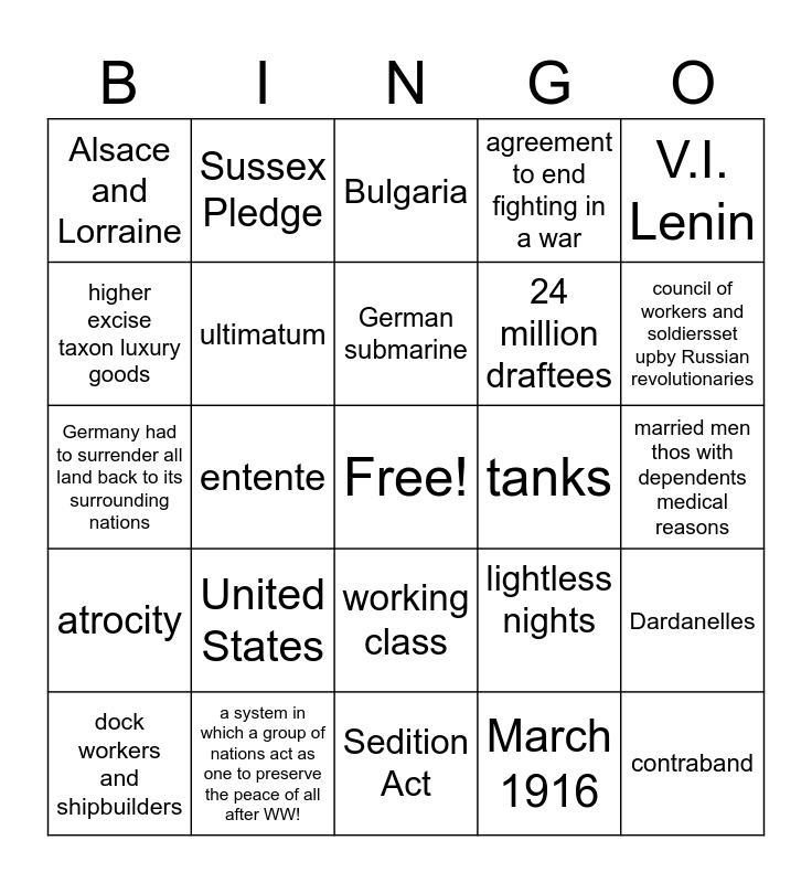 This bingo card has a free space and 24 words: United States, a system in which a group of nations act as one to preserve the peace of all after WW!, German submarine, dock workers and shipbuilders, V.I. Lenin, Alsace and Lorraine, higher excise taxon luxury goods, Sussex Pledge, tanks, working class, 24 million draftees, Germany had to surrender all land back to its surrounding nations, lightless nights, Dardanelles, ultimatum, March 1916, married men thos with dependents medical reasons, Bulgaria, council of workers and soldiersset upby Russian revolutionaries, entente, contraband, atrocity, agreement to end fighting in a war and Sedition Act.
