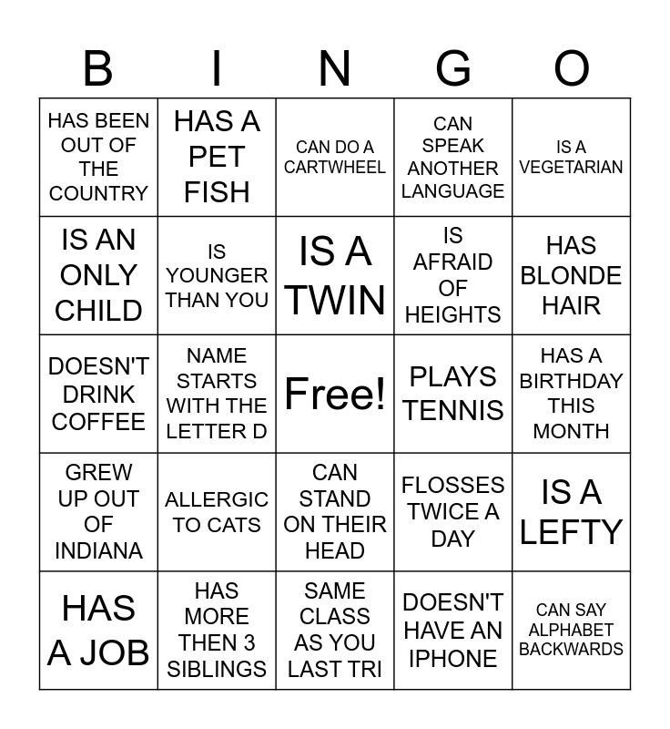This bingo card has a free space and 24 words: ALLERGIC TO CATS, HAS MORE THEN 3 SIBLINGS, IS A TWIN, HAS A JOB, IS A VEGETARIAN, HAS BEEN OUT OF THE COUNTRY, IS AN ONLY CHILD, HAS A PET FISH, PLAYS TENNIS, CAN STAND ON THEIR HEAD, IS AFRAID OF HEIGHTS, DOESN'T DRINK COFFEE, FLOSSES TWICE A DAY, IS A LEFTY, IS YOUNGER THAN YOU, DOESN'T HAVE AN IPHONE, HAS A BIRTHDAY THIS MONTH, CAN DO A CARTWHEEL, HAS BLONDE HAIR, NAME STARTS WITH THE LETTER D, CAN SAY ALPHABET BACKWARDS, GREW UP OUT OF INDIANA, CAN SPEAK ANOTHER LANGUAGE and SAME CLASS AS YOU LAST TRI.