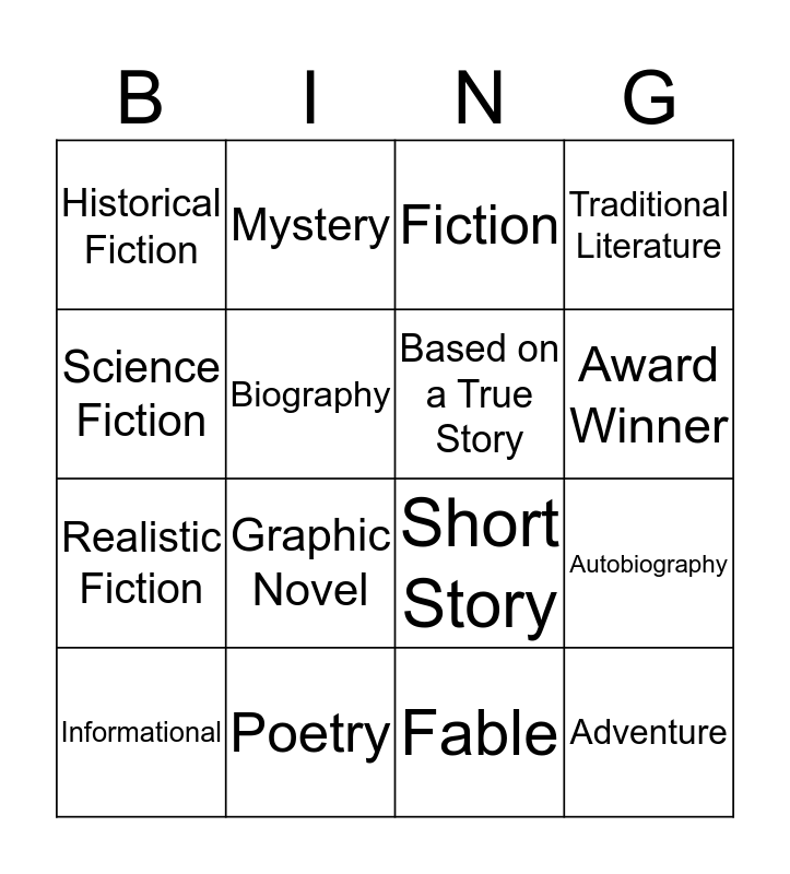 This bingo card has 16 words: Poetry, Autobiography, Fiction, Historical Fiction, Realistic Fiction, Mystery, Short Story, Fable, Science Fiction, Biography, Informational, Traditional Literature, Graphic Novel, Award Winner, Based on a True Story and Adventure.