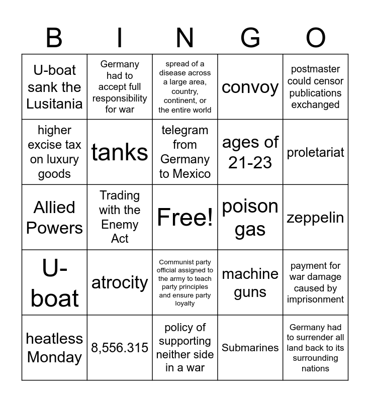 This bingo card has a free space and 24 words: atrocity, 8,556.315, telegram from Germany to Mexico, heatless Monday, postmaster could censor publications exchanged, U-boat sank the Lusitania, higher excise tax on luxury goods, Germany had to accept full responsibility for war, poison gas, Communist party official assigned to the army to teach party principles and ensure party loyalty, ages of 21-23, Allied Powers, machine guns, payment for war damage caused by imprisonment, tanks, Submarines, zeppelin, spread of a disease across a large area, country, continent, or the entire world, proletariat, Trading with the Enemy Act, Germany had to surrender all land back to its surrounding nations, U-boat, convoy and policy of supporting neither side in a war.