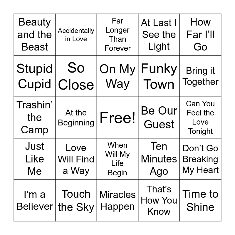 This bingo card has a free space and 31 words: Miracles Happen, A Whole New World, At the Beginning, I Won’t Say I’m in Love, Beauty and the Beast, Far Longer Than Forever, So Close, Ten Minutes Ago, Be Our Guest, That’s How You Know, Can You Feel the Love Tonight, Time to Shine, A Whole New World, If I Never Knew You, Bring it Together, Somebody to Love, Don’t Go Breaking My Heart, Love Will Find a Way, Just Like Me, When Will My Life Begin, How Far I’ll Go, Let it Go, I’m a Believer, Accidentally in Love, Funky Town, Stupid Cupid, At Last I See the Light, Trashin’ the Camp, Touch the Sky, On My Way and Lost in the Woods.