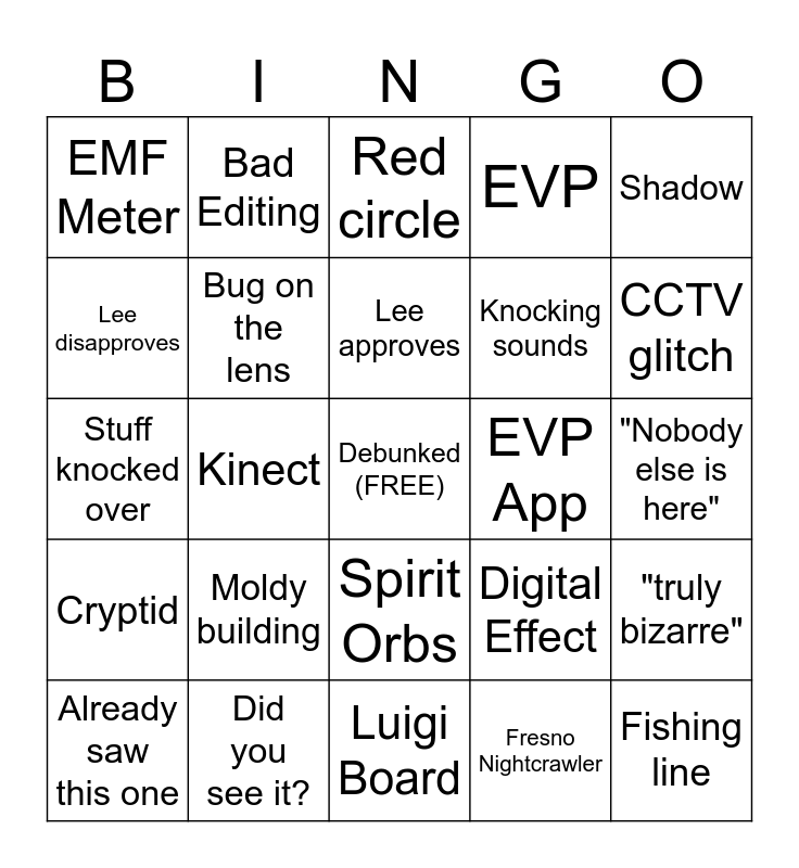 This bingo card has a free space and 45 words: Peeker, Fishing line, Sarah Spooks, Already saw this one, Mask, Fresno Nightcrawler, Red circle, Squatter, Shadow, Did you see it?, EVP, EVP App, Spirit Orbs, Moldy building, Aliens, Luigi Board, Potato Quality, Stuff knocked over, Unidentified sound, CCTV glitch, Bad Editing, Staged, Bad acting, EMF Meter, Running away, "Nobody else is here", Blindfold session, F*** your mother, Digital Effect, Cryptid, "truly terrifying", "truly bizarre", Dic laughs at media share, Nothing there, Great username, Kinect, Convenient framing, Object moves slightly, "Height of a child", Lee approves, Lee disapproves, Knocking sounds, Just a cat, Bug on the lens and Filming another screen.
