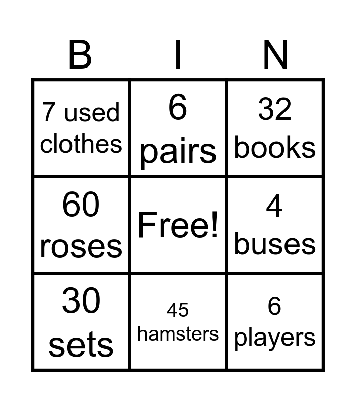 This bingo card has a free space and 14 words: 24 packages, 4 bags, 30 sets, 6 pairs, 60 roses, 6 players, 28 shorts, 7 hours, 45 hamsters, 7 used clothes, 24 crayons, 4 buses, 32 books and 9 nuts.