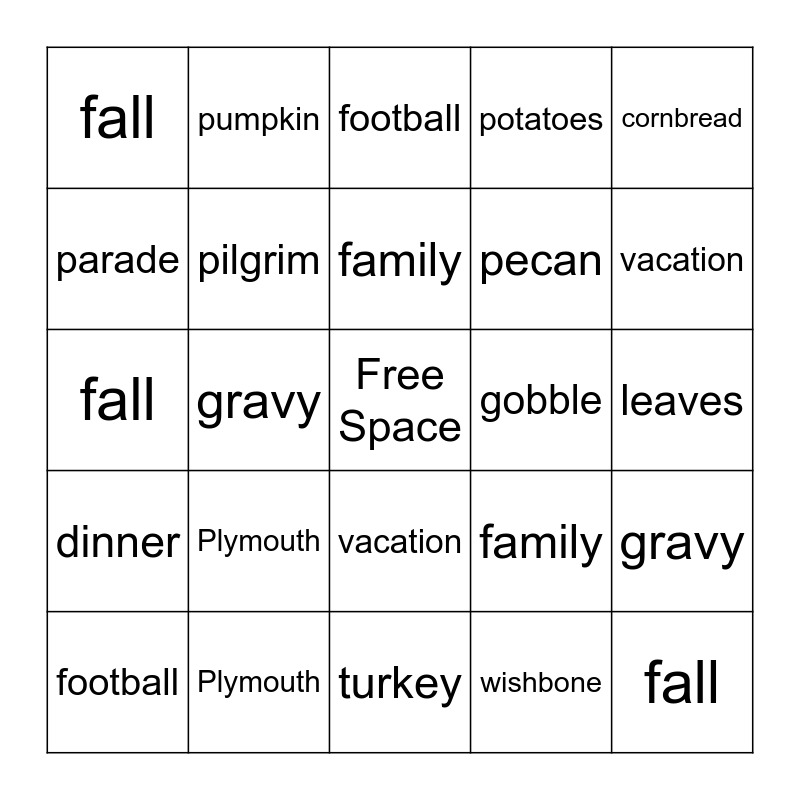 This bingo card has a free space and 97 words: cranberry, family, football, gravy, Mayflower, parade, pilgrim, potatoes, pumpkin, stuffing, turkey, vacation, gobble, dinner, grateful, fall, cornbread, leaves, yams, wishbone, Plymouth, pecan, holiday, pie, cranberry, family, football, gravy, Mayflower, parade, pilgrim, potatoes, pumpkin, stuffing, turkey, vacation, Free Space, dinner, grateful, fall, cornbread, leaves, yams, wishbone, Plymouth, pecan, holiday, pie, gobble, cranberry, family, football, gravy, Mayflower, parade, pilgrim, potatoes, pumpkin, stuffing, turkey, vacation, gobble, dinner, grateful, fall, cornbread, leaves, yams, wishbone, Plymouth, pecan, holiday, pie, pilgrim, Mayflower, leaves, stuffing, yams, gobble, grateful, cranberry, vacation, pecan, wishbone, holiday, potatoes, fall, Plymouth, turkey, cornbread, football, gravy, pie, family, parade, dinner and pumpkin.