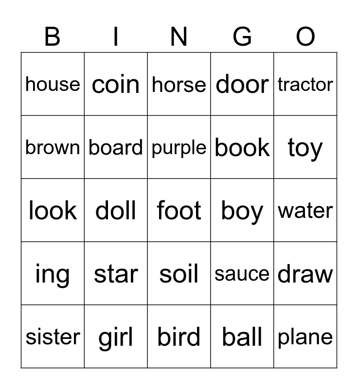 This bingo card has a free space and 24 words: star, girl, purple, sister, tractor, house, brown, coin, boy, soil, book, look, sauce, draw, board, ball, water, horse, toy, doll, plane, ing, door and bird.