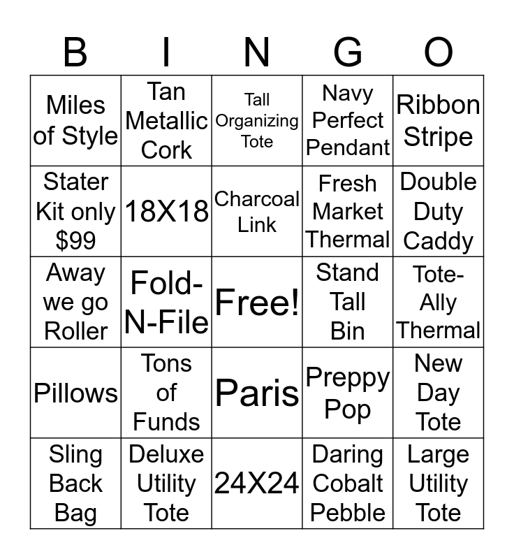 This bingo card has a free space and 24 words: Tons of Funds, Deluxe Utility Tote, Charcoal Link, Sling Back Bag, Ribbon Stripe, Miles of Style, Stater Kit only $99, Tan Metallic Cork, Stand Tall Bin, Paris, Fresh Market Thermal, Away we go Roller, Preppy Pop, New Day Tote, 18X18, Daring Cobalt Pebble, Tote-Ally Thermal, Tall Organizing Tote, Double Duty Caddy, Fold-N-File, Large Utility Tote, Pillows, Navy Perfect Pendant and 24X24.