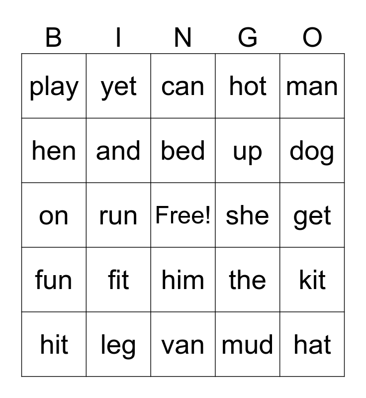 This bingo card has a free space and 24 words: fit, leg, bed, hit, man, play, hen, yet, she, him, up, on, the, kit, and, mud, get, can, dog, run, hat, fun, hot and van.