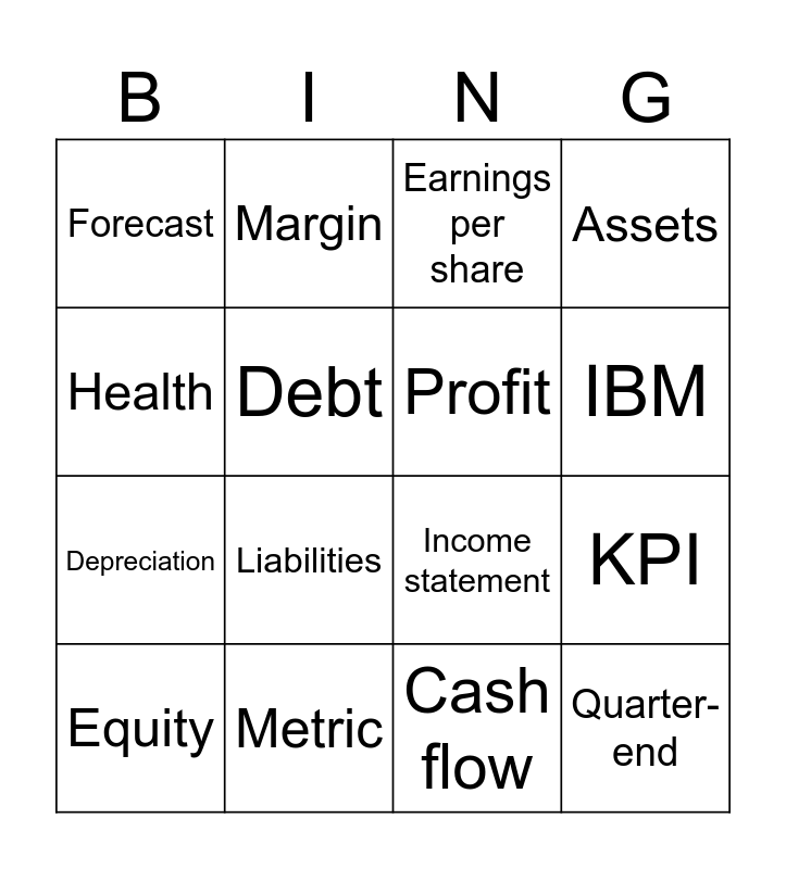 This bingo card has 16 words: Metric, KPI, Earnings per share, Forecast, Depreciation, Margin, Income statement, Cash flow, Health, Debt, Equity, Assets, Liabilities, IBM, Profit and Quarter-end.