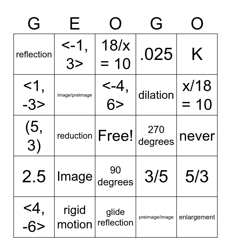 This bingo card has a free space and 24 words: Image, rigid motion, <-4, 6>, <4, -6>, K, reflection, <1, -3>, <-1, 3>, 270 degrees, 90 degrees, dilation, (5, 3), 3/5, 5/3, image/preimage, preimage/image, never, 18/x = 10, x/18 = 10, reduction, enlargement, 2.5, .025 and glide reflection.