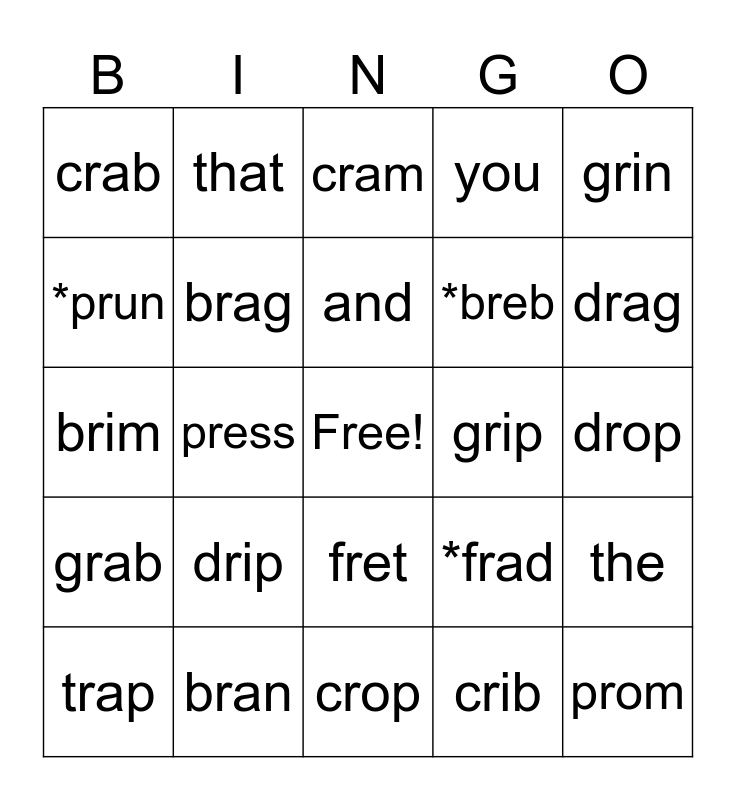 This bingo card has a free space and 29 words: trap, frog, press, trip, crab, cram, brag, drip, grip, bran, drop, prom, crop, crib, drag, trim, fret, grab, grin, brim, *frad, *trug, *breb, *prun, you, that, the, and and it.
