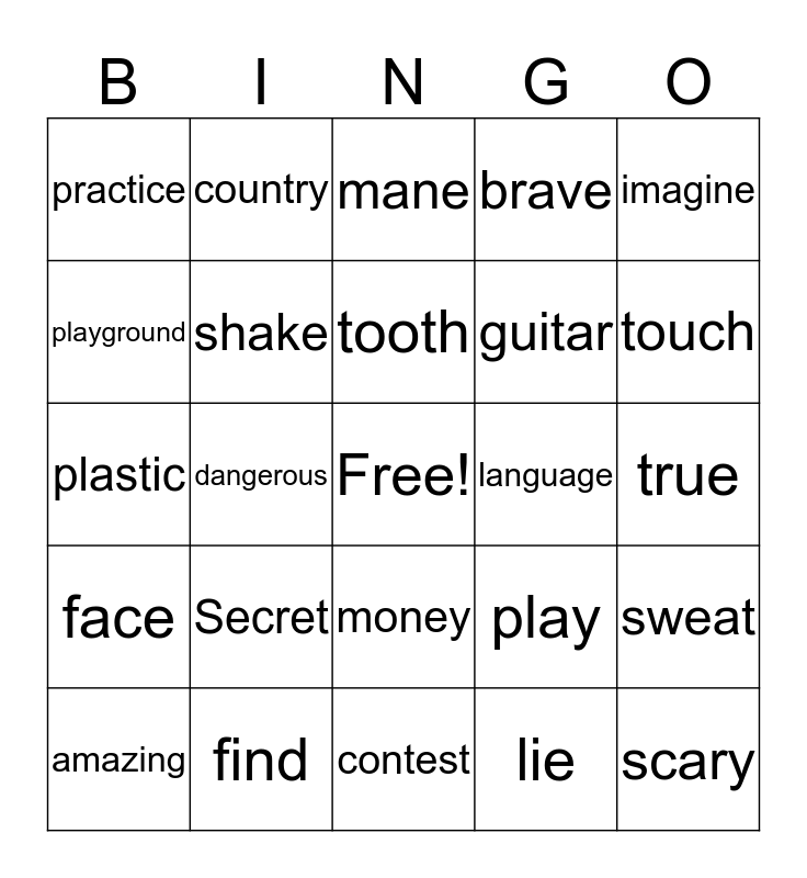 This bingo card has a free space and 24 words: Secret, find, tooth, amazing, imagine, practice, playground, country, language, money, guitar, plastic, play, sweat, shake, lie, true, mane, touch, dangerous, scary, face, brave and contest.