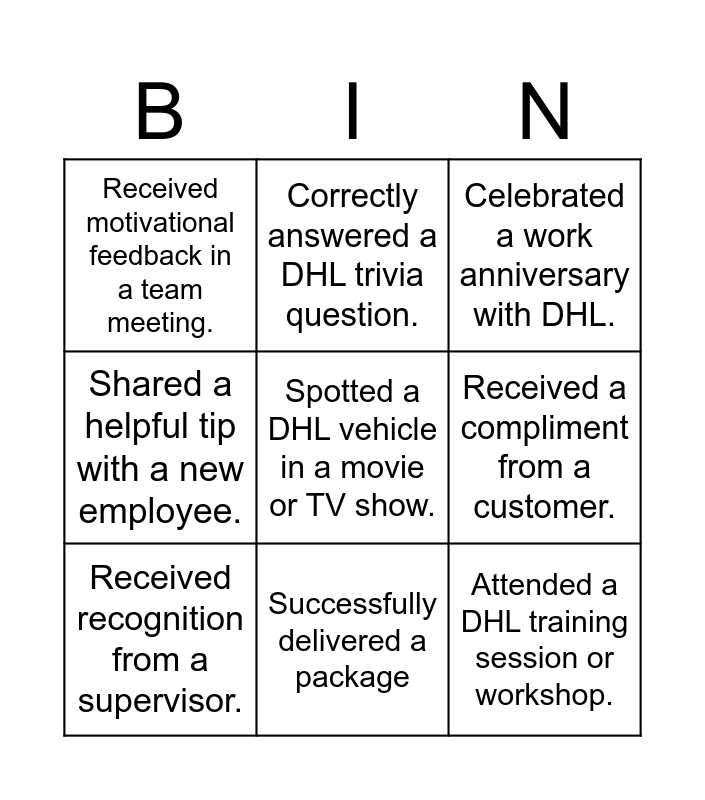 This bingo card has a free space and 8 words: Received a compliment from a customer., Celebrated a work anniversary with DHL., Correctly answered a DHL trivia question., Received recognition from a supervisor., Received motivational feedback in a team meeting., Attended a DHL training session or workshop., Shared a helpful tip with a new employee. and Successfully delivered a package.