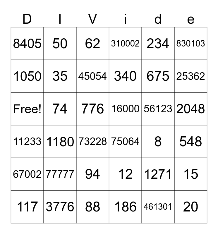 This bingo card has 36 words: 12, 94, 186, 1050, 11233, 16000, 35, 88, 234, 1271, 25362, 310002, 15, 74, 340, 8405, 67002, 56123, Free!, 62, 776, 1180, 75064, 73228, 8, 50, 675, 3776, 45054, 830103, 20, 117, 548, 2048, 77777 and 461301.