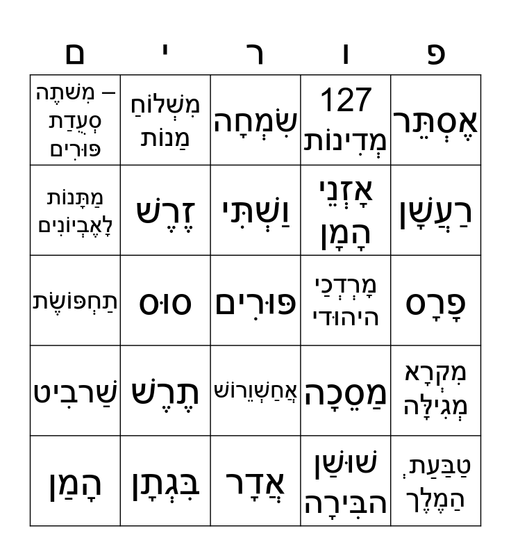 This bingo card has a free space and 24 words: תֶרֶשׁ, בִּגְתָן, וַשְׁתִּי, הָמַן, אֶסְתֵּר, מִשׁתֶה – סְעֻדַת פּוּרִים, מַתָּנוֹת לָאֶבְיוֹנִים, מִשְׁלוֹחַ מַנוֹת, מָרְדְכַי היהוּדי, אֲחַשְׁוֵרוֹשׁ, אָזְנֵי הָמָן, תַחְפּוֹשֶׂת, מַסֵכָה, מִקְרָא מְגִילָּה, זֶרֶשׁ, שׁוּשַׁן הבִּירָה, פָרָס, שִׂמְחָה, רַעֲשָׁן, סוּס, ְטַבַּעַת הַמֶלֶך, שַׁרבִיט, 127 מְדִינוֹת and אֲדָר.