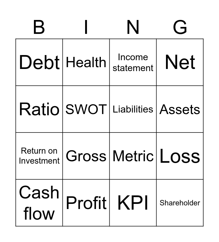 This bingo card has 16 words: Profit, Loss, Income statement, Debt, Return on Investment, Health, Metric, KPI, Ratio, SWOT, Cash flow, Net, Gross, Assets, Liabilities and Shareholder.