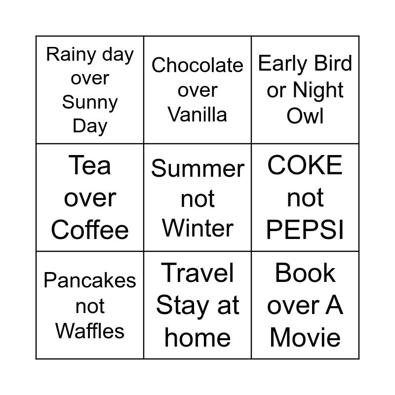 This bingo card has a free space and 8 words: COKE not PEPSI, Early Bird or Night Owl, Chocolate over Vanilla, Pancakes not Waffles, Rainy day over Sunny Day, Book over A Movie, Tea over Coffee and Travel Stay at home.