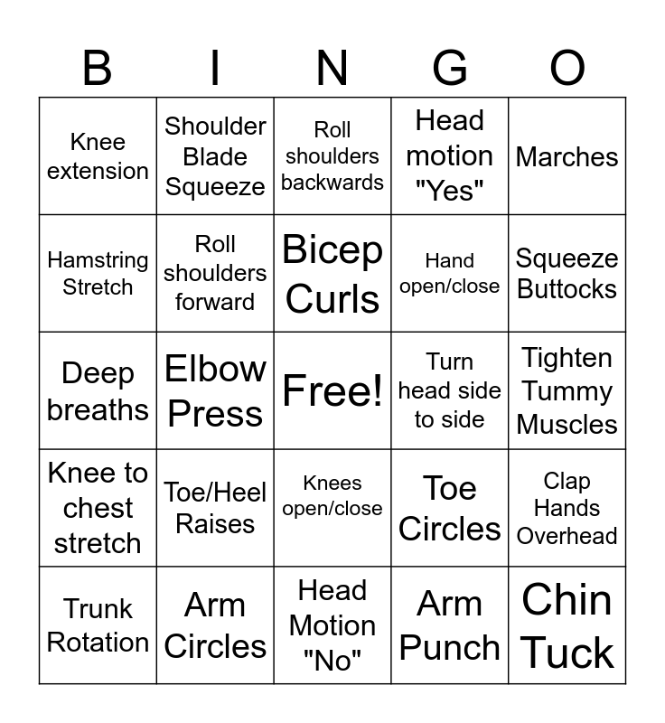 This bingo card has a free space and 24 words: Toe/Heel Raises, Arm Circles, Bicep Curls, Trunk Rotation, Marches, Knee extension, Hamstring Stretch, Shoulder Blade Squeeze, Turn head side to side, Knees open/close, Hand open/close, Deep breaths, Toe Circles, Clap Hands Overhead, Roll shoulders forward, Arm Punch, Tighten Tummy Muscles, Roll shoulders backwards, Squeeze Buttocks, Elbow Press, Chin Tuck, Knee to chest stretch, Head motion "Yes" and Head Motion "No".