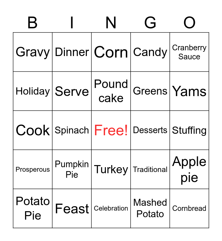 This bingo card has a free space and 24 words: Potato Pie, Pumpkin Pie, Pound cake, Mashed Potato, Cranberry Sauce, Gravy, Dinner, Corn, Desserts, Stuffing, Cook, Serve, Traditional, Apple pie, Holiday, Feast, Celebration, Candy, Yams, Prosperous, Spinach, Turkey, Greens and Cornbread.