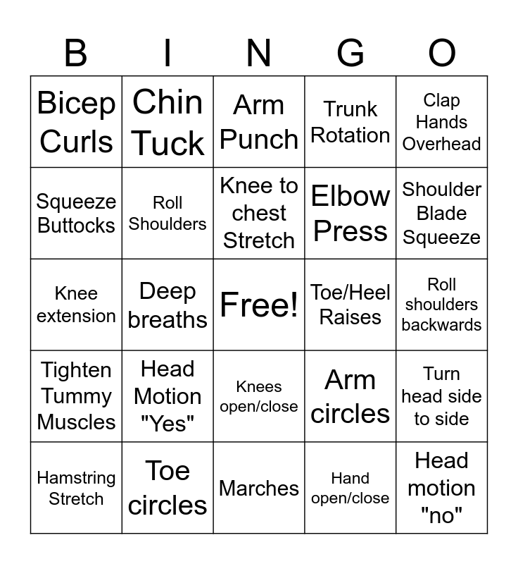 This bingo card has a free space and 24 words: Head Motion "Yes", Toe circles, Knee to chest Stretch, Hamstring Stretch, Clap Hands Overhead, Bicep Curls, Squeeze Buttocks, Chin Tuck, Toe/Heel Raises, Knees open/close, Elbow Press, Knee extension, Arm circles, Turn head side to side, Roll Shoulders, Hand open/close, Roll shoulders backwards, Arm Punch, Shoulder Blade Squeeze, Deep breaths, Head motion "no", Tighten Tummy Muscles, Trunk Rotation and Marches.