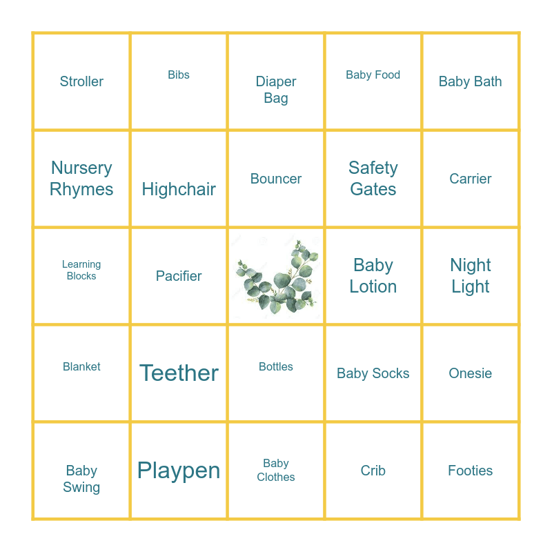 This bingo card has a free space and 24 words: Teether, Playpen, Bouncer, Baby Swing, Baby Bath, Stroller, Nursery Rhymes, Bibs, Baby Lotion, Bottles, Safety Gates, Learning Blocks, Baby Socks, Onesie, Highchair, Crib, Night Light, Diaper Bag, Carrier, Pacifier, Footies, Blanket, Baby Food and Baby Clothes.