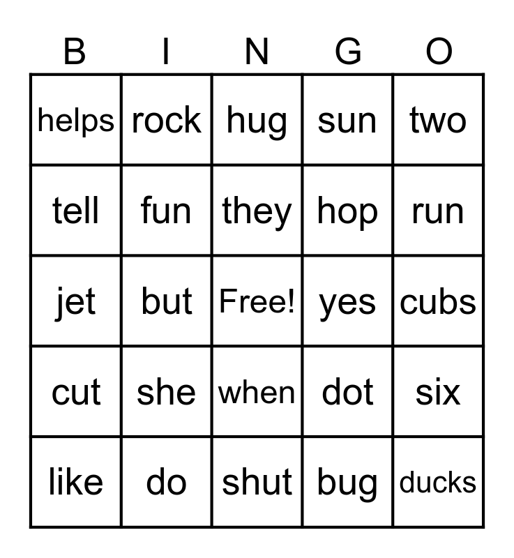 This bingo card has a free space and 24 words: she, do, they, like, two, helps, tell, rock, yes, when, hop, jet, dot, six, fun, bug, cubs, hug, run, but, ducks, cut, sun and shut.