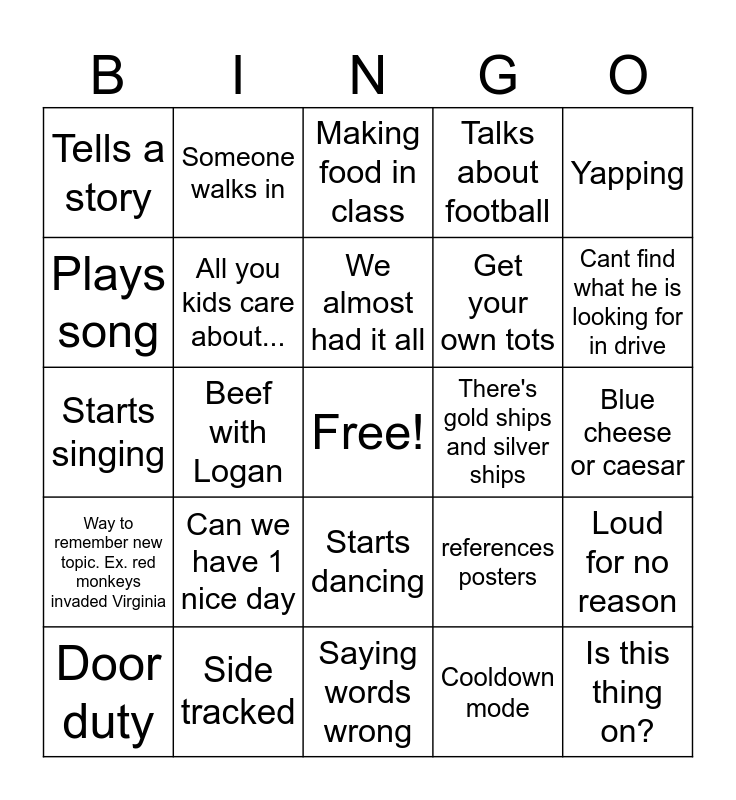 This bingo card has a free space and 24 words: Can we have 1 nice day, Side tracked, We almost had it all, Door duty, Yapping, Tells a story, Plays song, Someone walks in, There's gold ships and silver ships, Starts dancing, Get your own tots, Starts singing, references posters, Loud for no reason, All you kids care about..., Cooldown mode, Blue cheese or caesar, Making food in class, Cant find what he is looking for in drive, Beef with Logan, Is this thing on?, Way to remember new topic. Ex. red monkeys invaded Virginia, Talks about football and Saying words wrong.