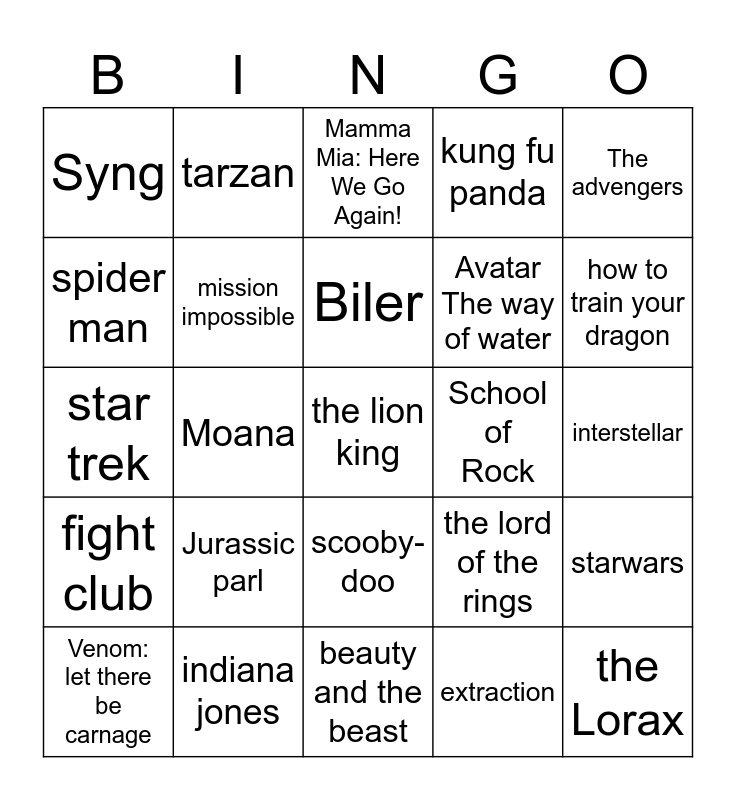 This bingo card has a free space and 38 words: Shrek, Mulan, Kung fu fighting, mission impossible, starwars, Jurassic parl, Biler, Hund og kat imellem - Kitty Galores hævn, The advengers, Avatar The way of water, Moana, kung fu panda, the Lorax, interstellar, spider man, fight club, Djævlens håndlanger (Eye of the Tiger), Mamma Mia: Here We Go Again!, Guardians of the Galaxy, School of Rock, Syng, indiana jones, how to train your dragon, Venom: let there be carnage, lady and the vagabond, beauty and the beast, Wall-e, games of thrones, barbie, The nightmare before cristmas, grimlings, scooby-doo, extraction, tarzan, hobbiten, the lord of the rings, star trek and stranger things.