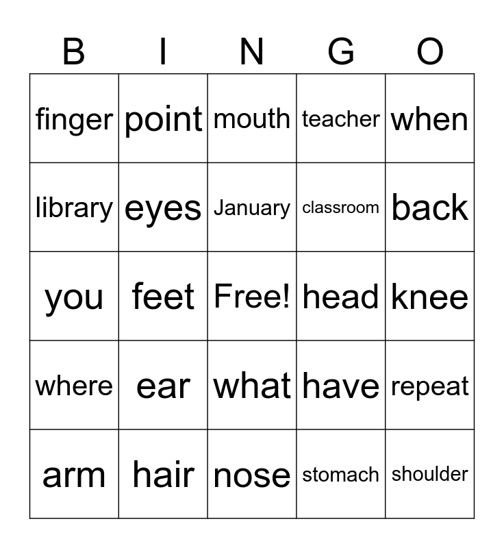 This bingo card has a free space and 29 words: arm, leg, feet, hands, finger, mouth, eyes, ear, head, hair, knee, shoulder, nose, stomach, back, backpack, what, where, when, you, have, here, classroom, library, teacher, point, repeat, January and May.